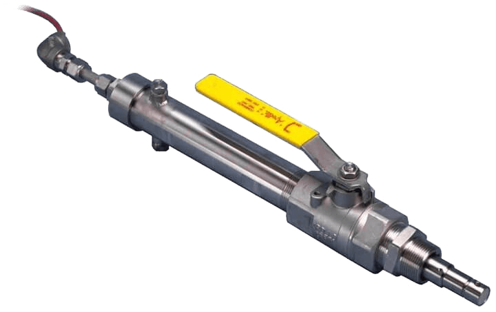 The TB27 conductivity cell can be inserted or removed from process lines or vessels via a ball valve without disturbing the process. The TB27 sensor is designed for applications that exceed standard hot-tap sensor pressure ratings and for operator safety. An extraction housing isolates the operator from the process fluid. This housing has 1/4 in. ports for flushing, draining, pressurizing, or de-pressurizing this chamber. Ruggedly constructed of 316 stainless steel, these sensors withstand the most demanding processes and measurement requirements.